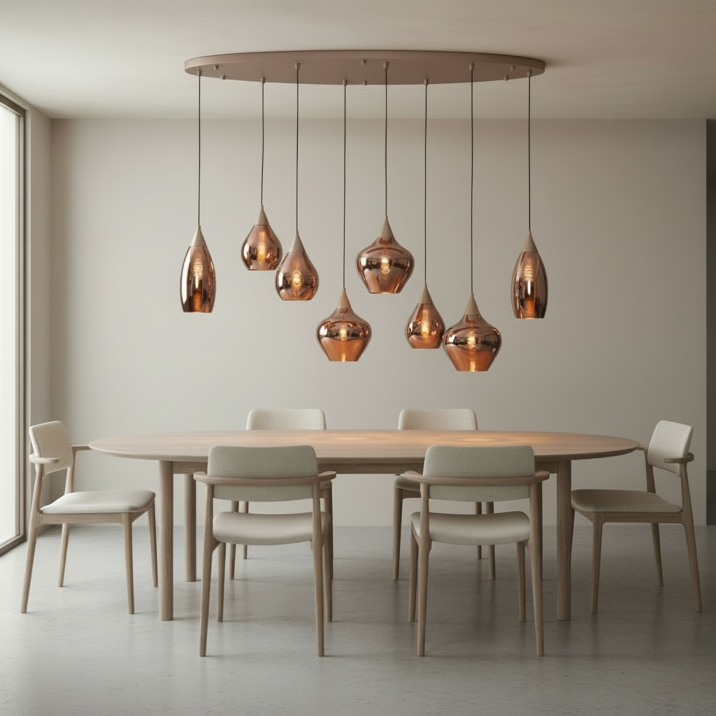 Design hanglamp mix new form 8 lichts op 120 x30cm zwarte ovale plaat.