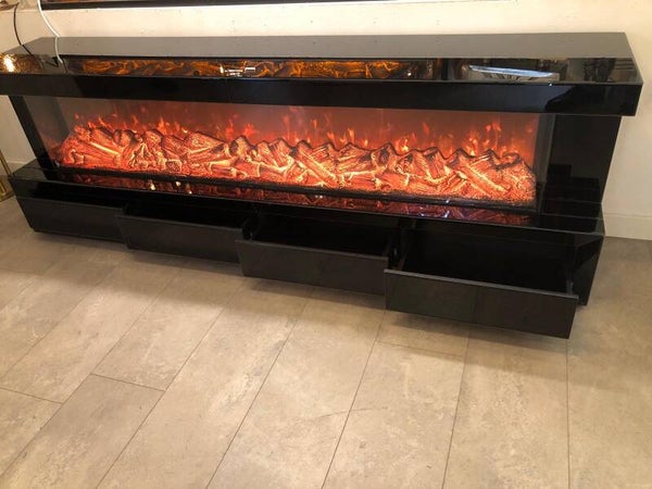 tv-meubel - 200cm - met 180cm 3D sfeerhaar - 4 strakke laden - in wit, zwart en sepia - sfeerhaard met afstandsbediening verschillende kleuren haard