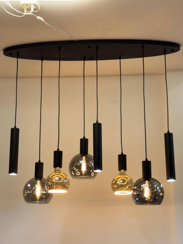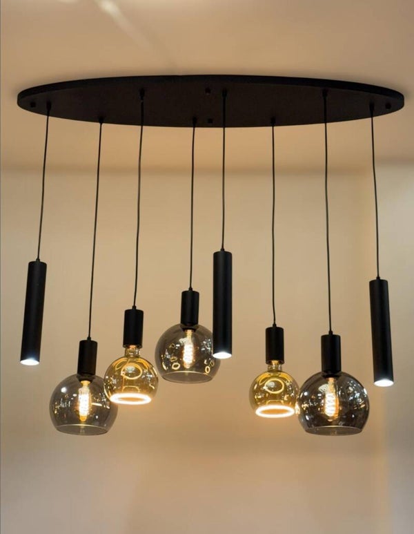 Op zoek naar een stijlvolle en functionele hanglamp die luxe en modern design combineert? Deze hanglamp met een zwarte ovale plafondplaat van 120 cm is een echte blikvanger! Met 3 smoke glazen bollen (20 cm), 3 x 30cm lange kokervormige GU10 spots en 2 Segula Floating Globes, biedt deze lamp een perfecte mix van sfeerverlichting en gericht licht. Dankzij de verstelbare pendels tot 150 cm bepaal je zelf de ideale hoogte voor jouw ruimte.