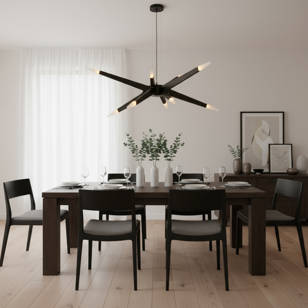 Met een indrukwekkende doorsnede van 100 cm en een hoogte van 150 cm, vult de Mikado elke ruimte met zijn unieke aanwezigheid. De kruisvormige armen en verfijnde afwerking maken deze lamp tot een waar kunstobject aan het plafond.