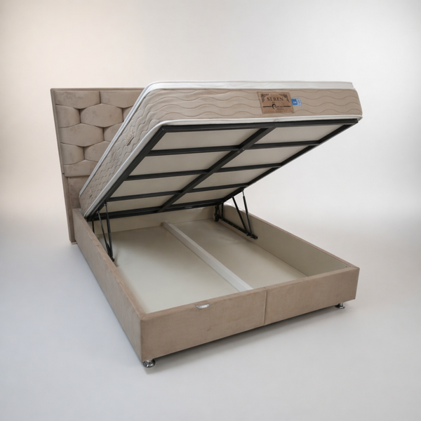 De luxe beige velvet stof zorgt voor een warme, chique uitstraling en voelt heerlijk zacht aan. Het moderne hoofdbord geeft jouw slaapkamer een exclusieve look, terwijl de handige opbergruimte onder het bed ideaal is voor het netjes opbergen van beddengoed en andere spullen.