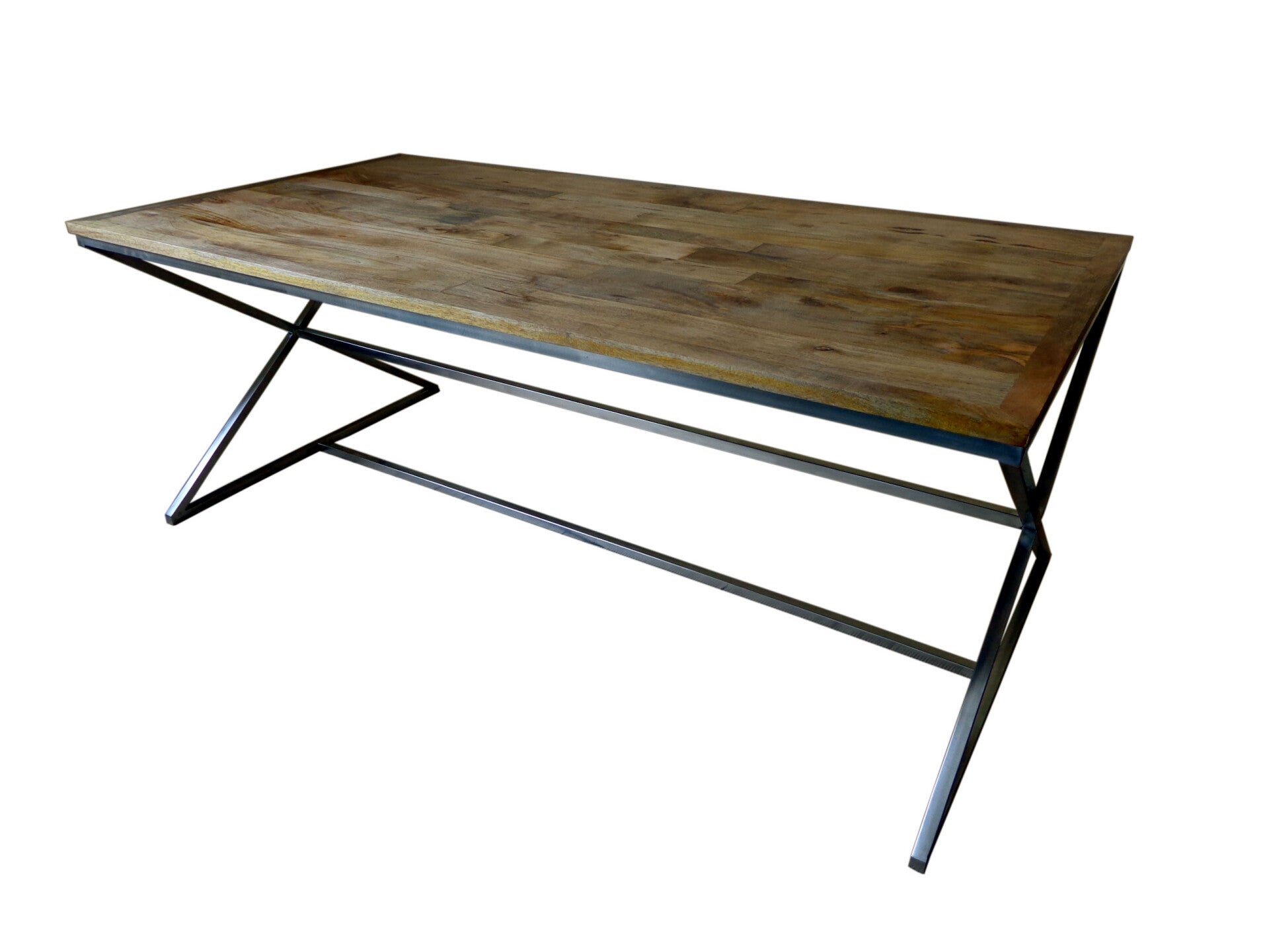 Hele Sheike eettafel van mango hout naturel kleur en mat rvs onderstel.
