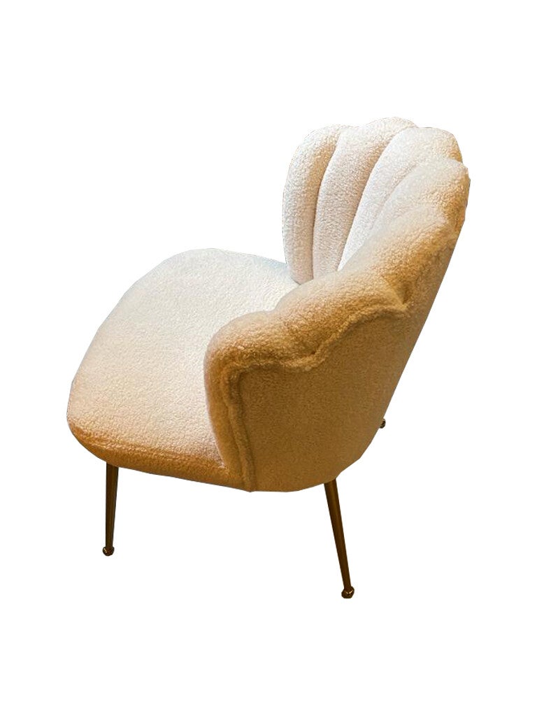 Design eetkamerstoel Schelp in taupe teddy beer stof en gouden poten.