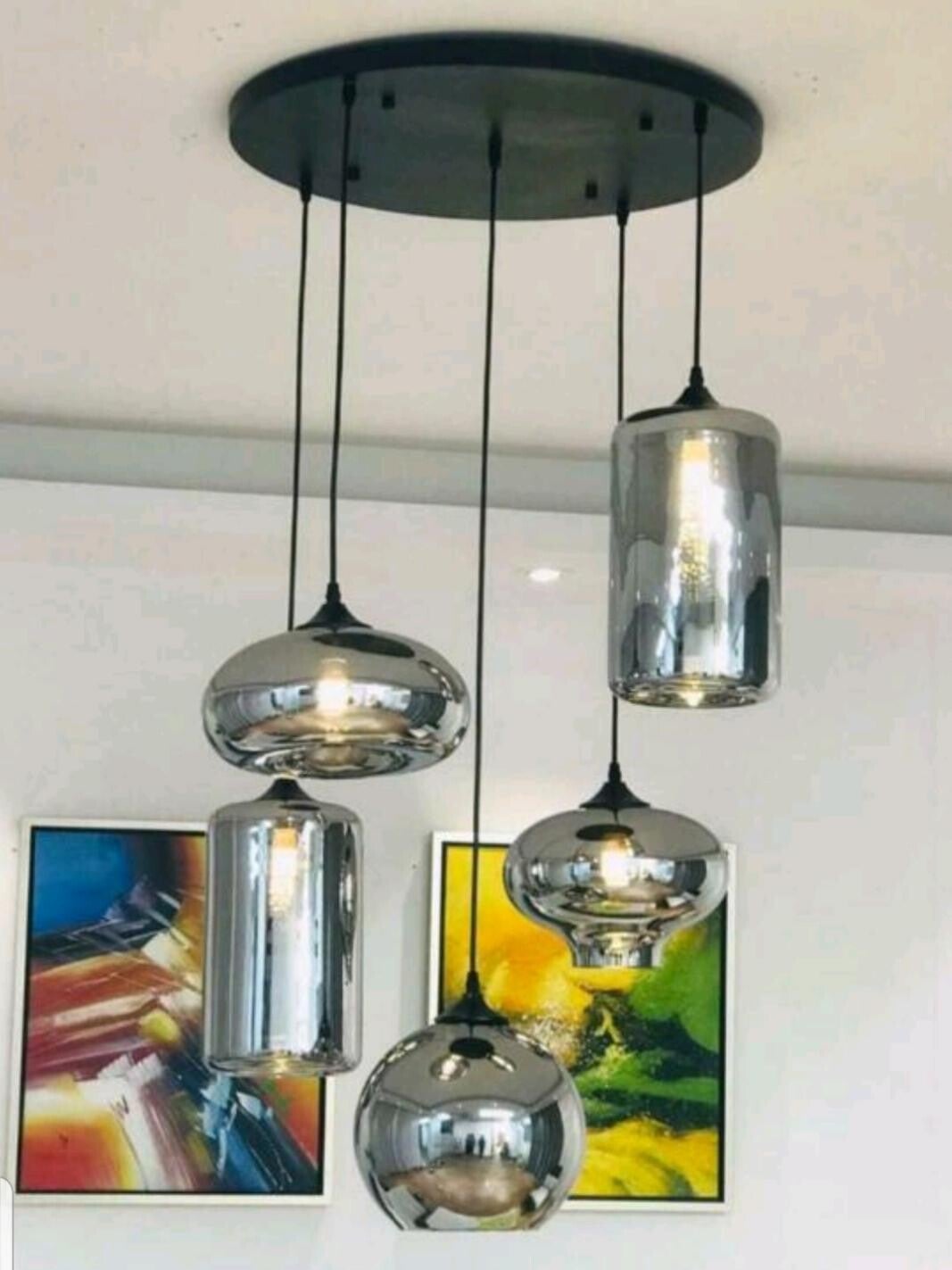 Hanglamp 5 lichts smokey bulbs mix glas - 60cm dia zwarte ronde plaat - 180cm lang max